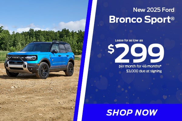 *New 2025 Bronco Sport model. Lease for $299 per month for 48 months and 7,500 miles per year. Example STK #47228. $3,000 plus first payment due at signing. Not all may qualify. Plus tax, tag, title, acquisition fee of $695 and includes a $499 closing fee with approved credit. No security deposit required. No down payment required with Ford. See dealer for complete details. Offer ends 03/31/26.